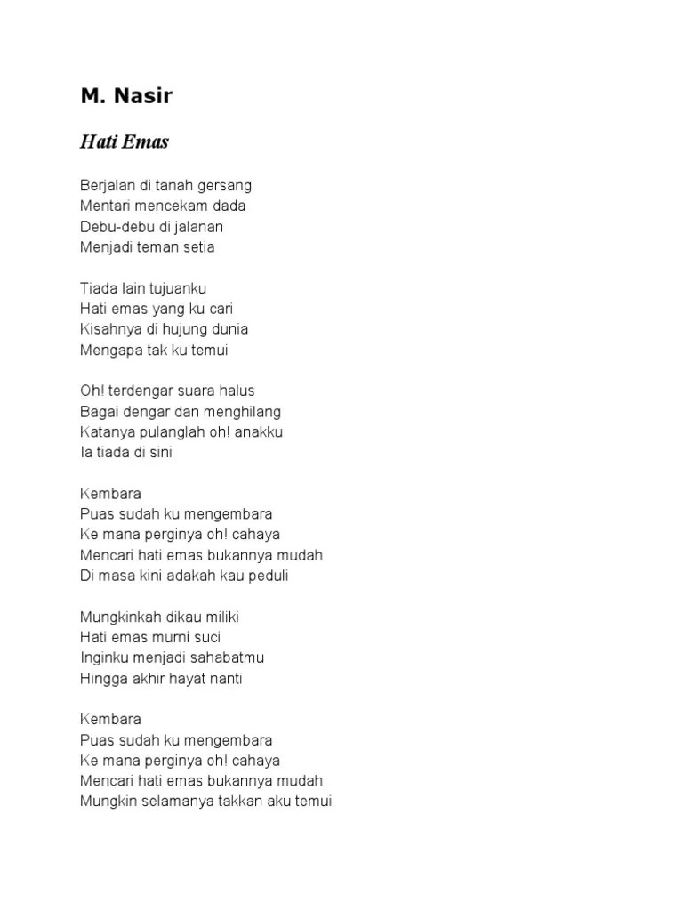 Hati emas yang ku cari Find the lyrics for hati emas by m nasir on rockol. Nasir berjalan di tanah gersang. Em berjalan di tanah gersang c mentari mencekam dada am b debudebu di jalanan em menjadi teman setia em tiada lain tujuanku c hati emas yang ku cari am b c . Hati emas kembara lirik lagu melayu m. Hati emas yang ku cari Credits unfortunately we're not authorized to show these lyrics. Nasir hati emas berjalan di tanah gersang. Hati emas (lirik) m nasir & kembara.